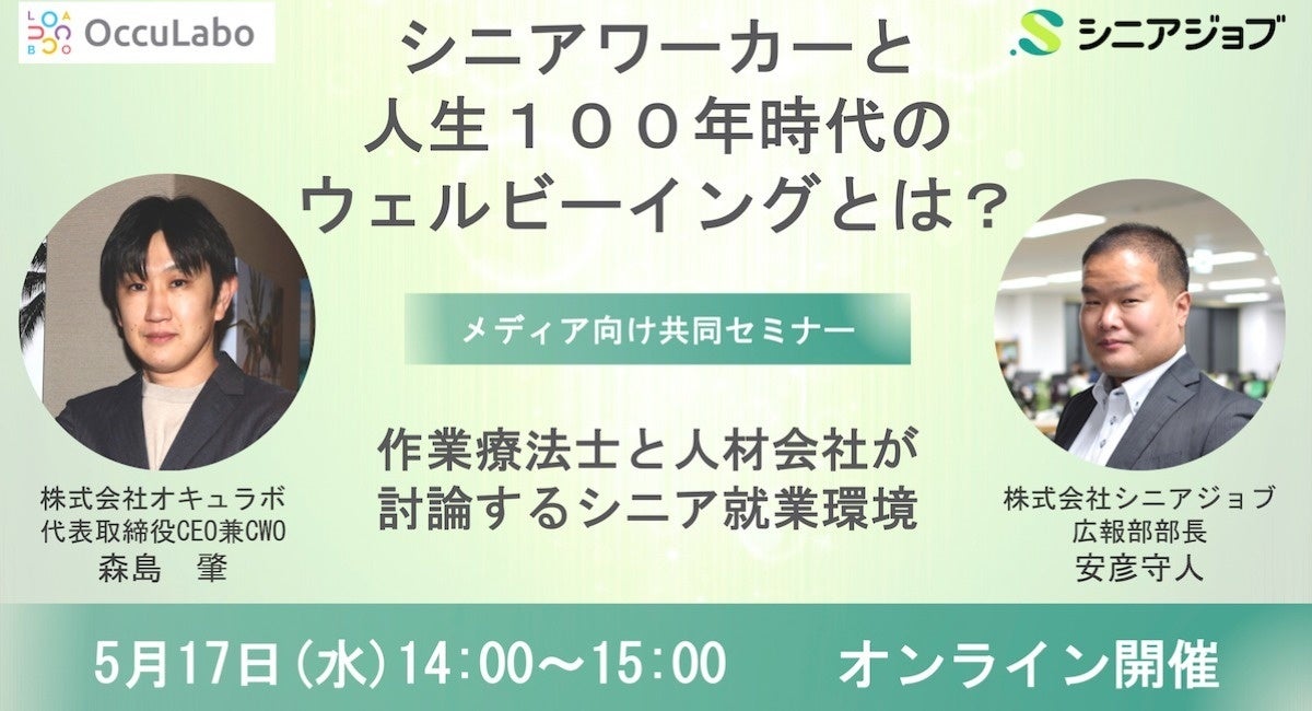 株式会社オキュラボのプレスリリース(2023年4月13日 17時21分)「シニアワーカーと人生100年時代のウェルビーイングとは?」5月17日開催〜シニアジョブとオキュラボが報…